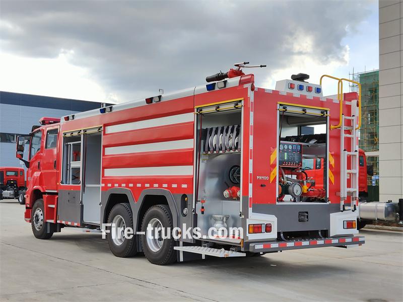 이수즈 GIGA 6X4 10㎥ 폼 소방차는 이수즈 GIGA 6X4 섀시를 기반으로 제작되었으며, 휠베이스는 4600mm+1370mm입니다. 이 차량은 이수즈 6UZ1-TCG61 엔진과 고속 12단 변속기를 장착하고 있습니다. 차체 전면에는 장비실이 있으며, 중간 부분에는 8500L 용량의 탄소강 물탱크와 1500L 용량의 스테인리스강 폼탱크가, 후면에는 CB10/60-XZ 소방펌프, 제어 패널, 소방호스, 소방 장비 등이 갖춰진 펌프실이 있습니다. 지붕에는 PL8/48 화재 모니터가 설치되어 있습니다.