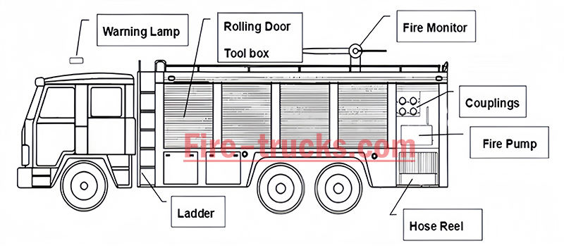 • 펌프실: 소방호스, 물 수집기, 필터, 소방 노즐, 폼건, 흡입 호스 렌치, 감속기 등이 장착되어 있습니다.